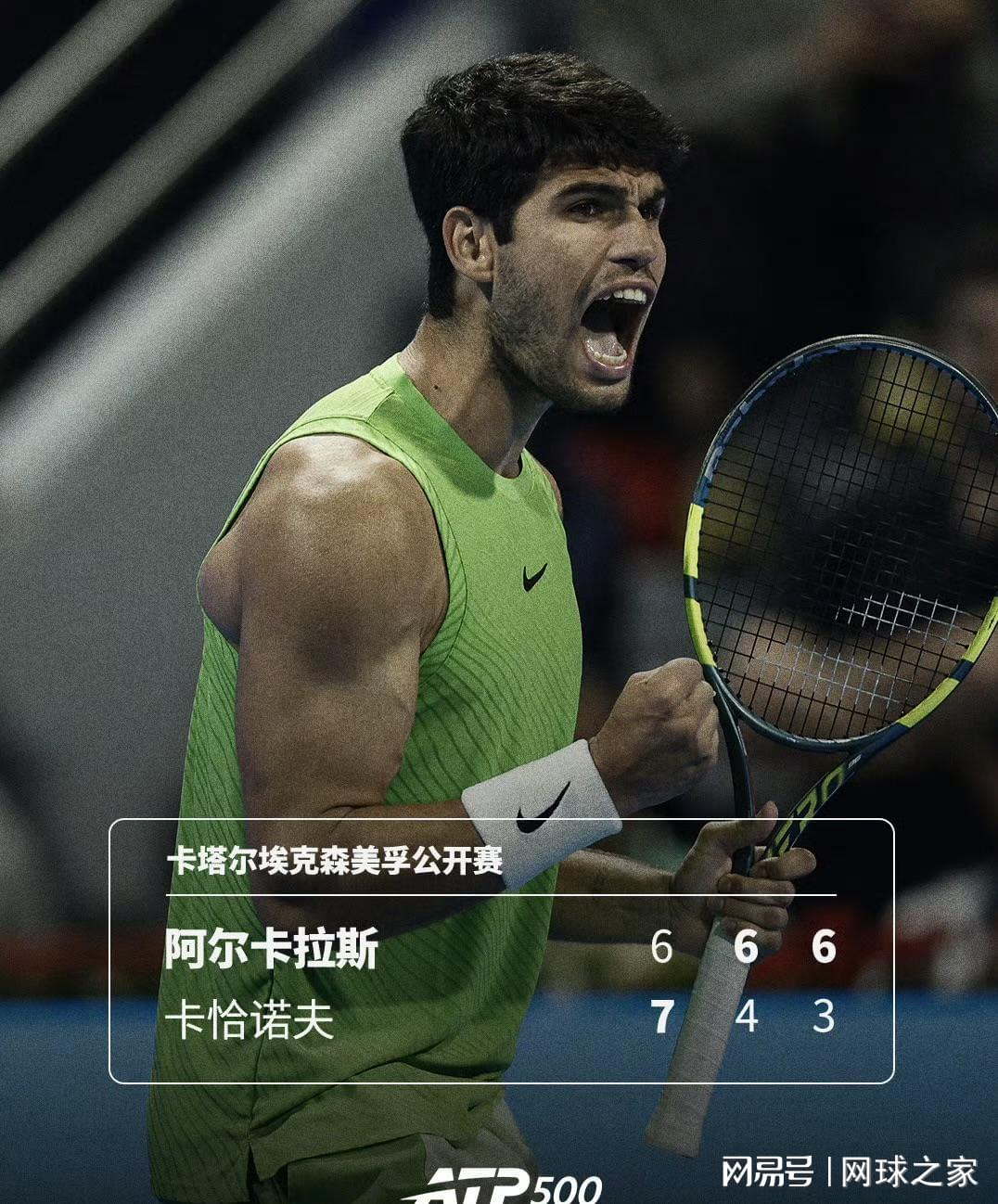 相比于辛纳的意外出局,世界第一阿尔卡拉斯的晋级之路同样不轻松。面对俄罗斯名将卡恰诺夫,西班牙巨星以6-7(6)/6-4/6-3逆转取胜,艰难闯入多哈站四强。